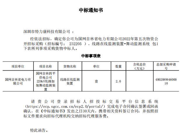 經(jīng)依法招標(biāo),確定我司(深圳特力康)為國網(wǎng)吉林省電力有限公司2022年第五次物資公開招標(biāo)采購(招標(biāo)編號: 232205 ),線路在線監(jiān)測裝置-舞動(dòng)監(jiān)測系統(tǒng)包1下表所列事項(xiàng)采購貨物中標(biāo)人。中標(biāo)通知如下:
